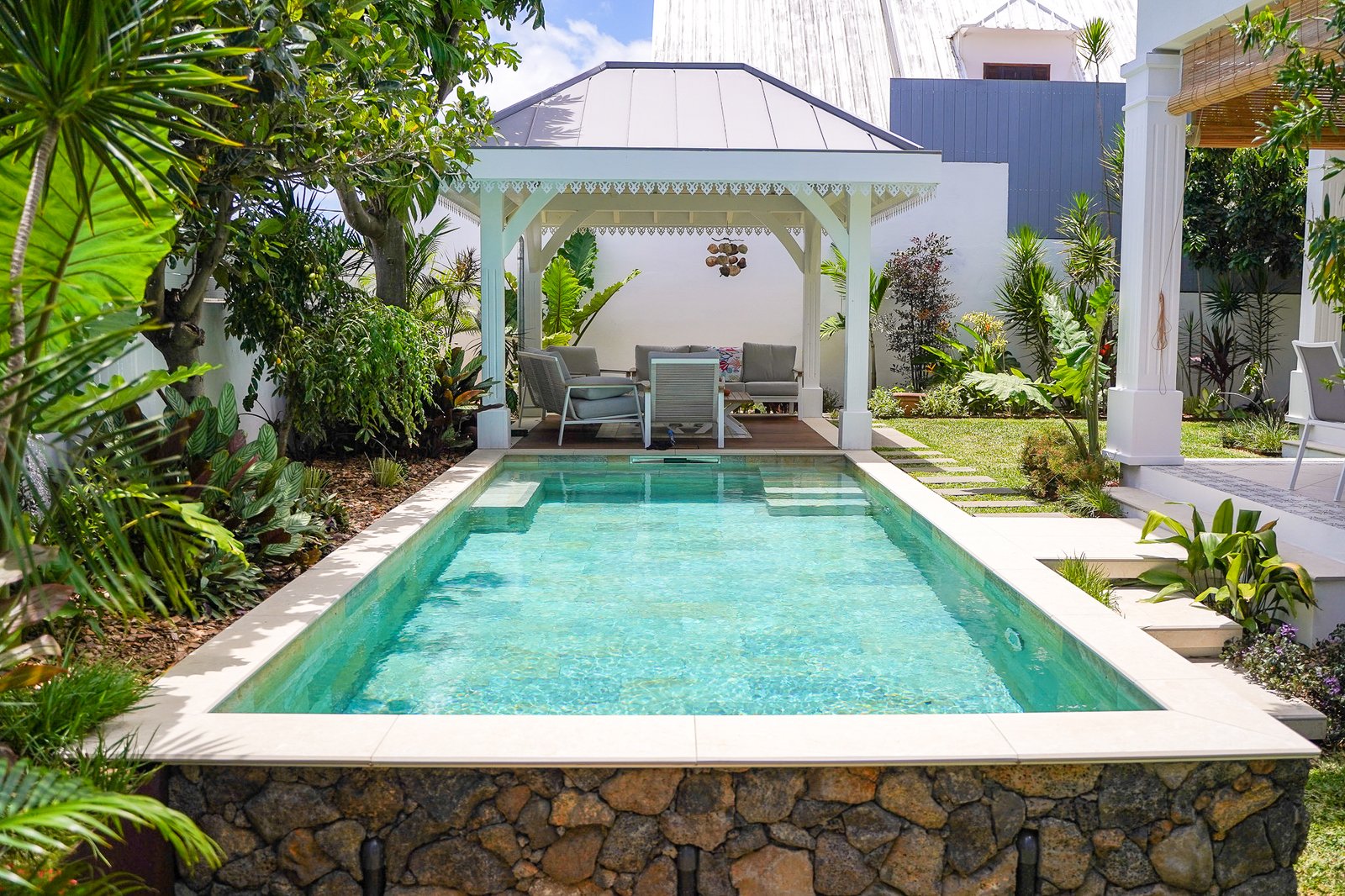 Pour ce chantier nous avons travaillé sous la coupe d’un architecte paysager, mandaté par les clients qui avaient comme projet de refaire tout le jardin, la piscine, le kiosque et les espaces verts.